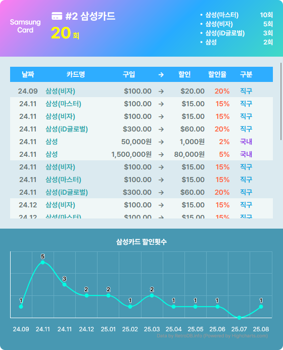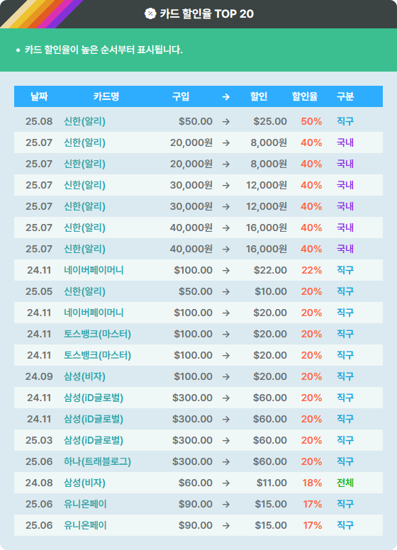 순위표를 보면 할인율이 최고 50%에 달하며 최근 몇달간에 공격적인 할인으로 순위권을 전부 이 카드가 차지했어요.